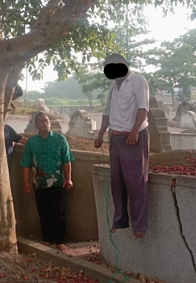 Berdasarkan keterangan saksi, mereka yang saat itu sedang membersihkan makam yayasan, Spontan kaget melihat seorang laki laki dengan posisi tergantung di pohon dengan leher yang terjerat seutas tali.