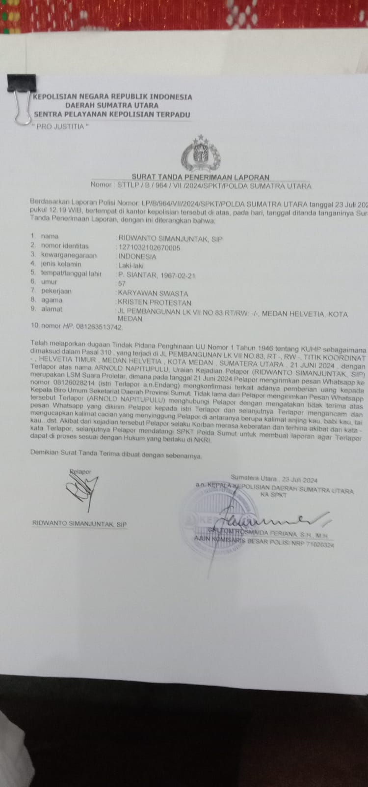Ridwanto Simanjuntak,SIP selaku ketua LSM SUARA PROLETAR menyatakan bahwa pihaknya telah melaporkan AN yang merupakan suami dari E ke poldasu akibat respon yang diberikan AN atas klarifikasi yang dimohonkan lewat Whats App (WA) pada tanggal 21 Juni 2024 yang lalu tersebut adalah merupakan penghinaan, ancaman, cacian dengan melontarkan kata-kata yang tidak beretika yang ditujukan AN kepada ketua LSM SUARA PROLETAR,