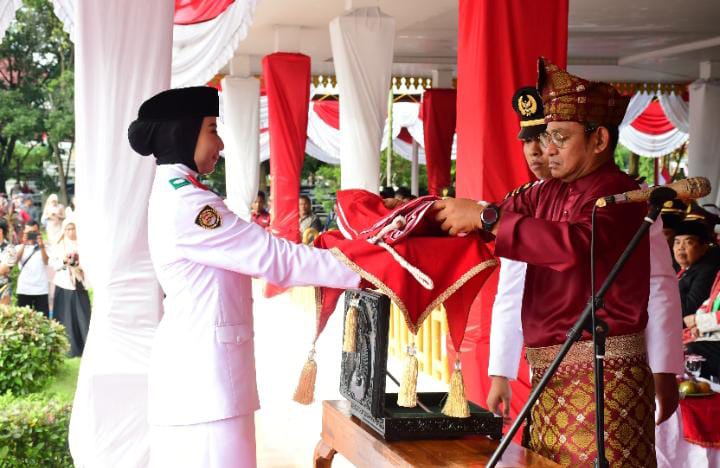 Wanita berusia 16 tahun selaku pembawa baki bendera, tampil sigap dan elegan. Sesekali dia melontarkan senyum, terlebih saat akan mengambil bendera dari Pj Bupati Deliserdang Wiriya Alrahman.