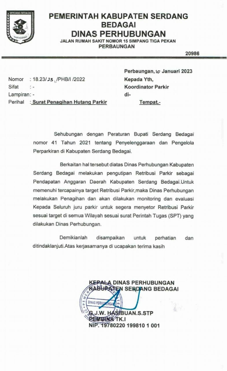 “SPT itu setiap bulan dikeluarkan oleh Bupati melalui Dinas Perhubungan, dan pendapatan parkir untuk di Sei Rampah memang kurang bukan seperti Perbaungan”.