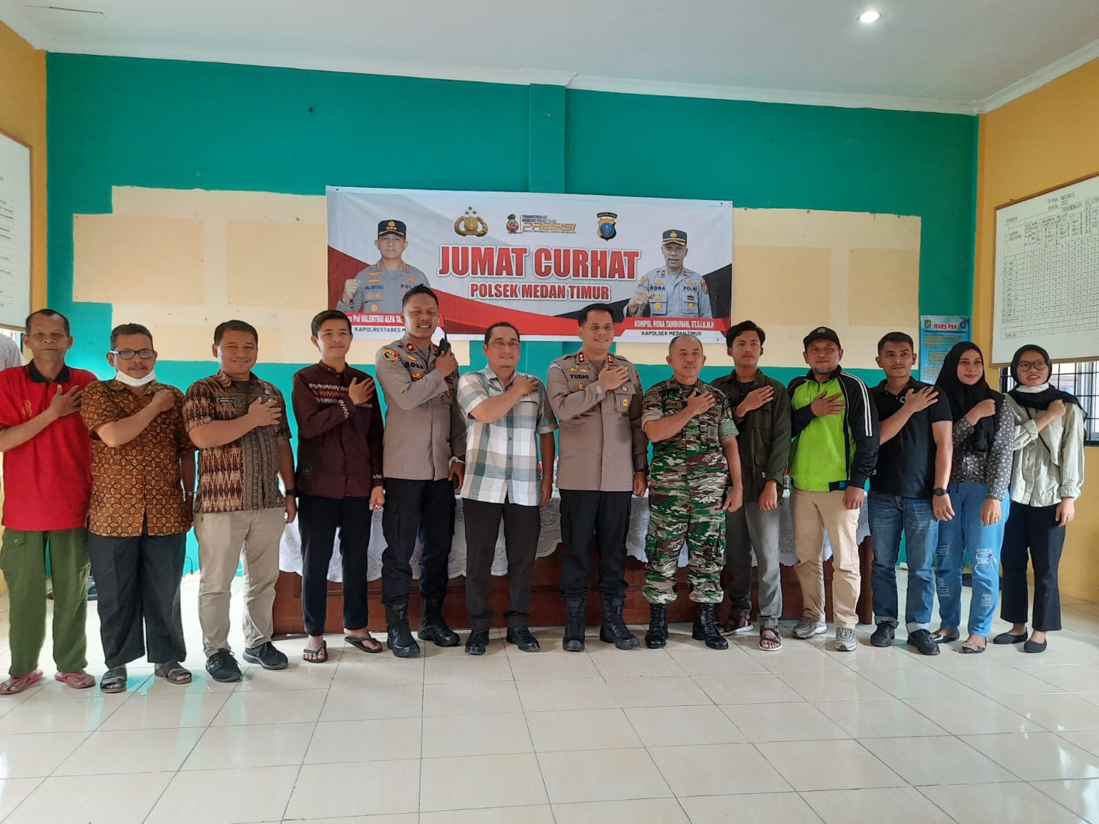 Kapolsek Medan Timur Kompol Rona Tambunan mendampingi Waka Polrestabes Medan AKBP Yudhi Hery Setiawan mendengarkan curhatan warga di Kantor Lurah Sidodadi Jalan Madong Lubis Sidodadi Kecamatan Medan Timur, Jumat (6/1/2023).
